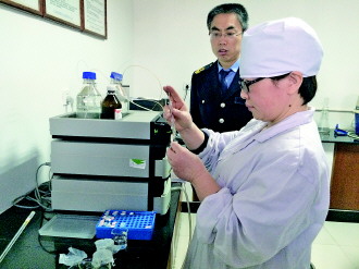 ▲乳制品企业对市食药监局提供的“考题”进行检测。 记者 王帅 摄