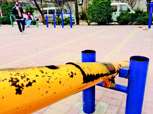 不仅如此,在社区广场上的健身器材中,小朋友喜欢的跷跷板也出现了明显的破损。记者在广场上看到,在广场最南侧的跷跷板已经属于危险器材,跷跷板两端的扶手已经没有了,而且主杆中间已经断裂,锈迹斑斑。正在广场上玩耍的两名小学生表示,跷跷板成现在这个样子有一段时间了,他们现在也都不敢坐在上面玩了,但还是时常看到有些婴幼儿坐在上面,很危险。