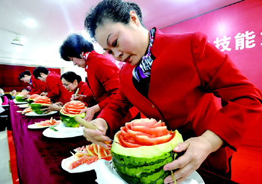 济南某家政公司的技能大赛上,月嫂用西瓜雕刻“幸福玫瑰”。本报记者 张中 摄(文图无关)