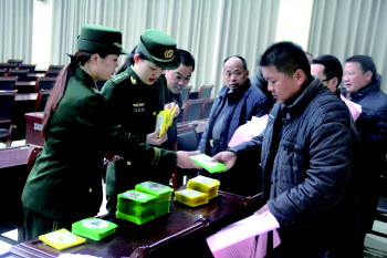17日上午,菏泽消防支队联合教育部门,在牡丹区教育会堂为全市中小学校长、幼儿园园长和校内消防专兼职教师举行消防安全示范课培训。菏泽消防支队向参加培训的397所中小学、幼儿园免费发放了“全国消防安全示范课”评选活动中筛选出的首批“全国消防安全示范课”优秀课件光盘。图为:消防工作人员向教师发放课件光盘。