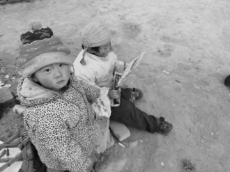 俩孩子坐在院内的石板上玩耍。 本报记者 孙越 摄