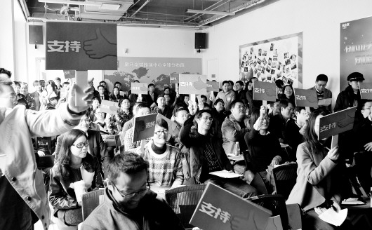 ◤北京中关村创业大街黑马会咖啡馆内的投资路演活动,投资客用支持和拍砖表示支持程度。