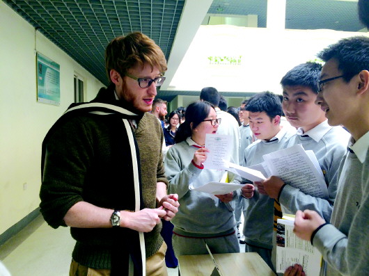19日下午,首届春季海外大学展在济南市外国语学校三箭校区举行,15所海外大学推荐者来到外国语学校,向国际班的200余名学生分享海外大学的生活和学习。 本报记者 许亚薇 摄