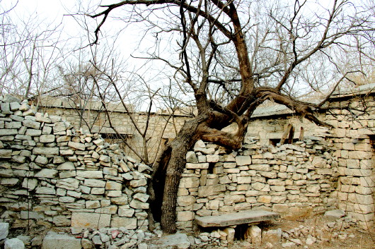 这里的房屋大多是四合院,院内都有地窖。地窖的用途一是家庭妇女冬天在地窖内纺线,二是为避免战乱藏在里面。沿白色石阶登上房顶,放眼四望,周围是一眼望不到边的白花花的石房石屋,门与门相对,户与户相连。据介绍街巷全是青石铺就,街巷串连的石头房屋1000多间。这里简直就是石头城:路面是石头铺的,房屋是由石头垒成,不仅仅正屋、厢房是,连大门口的拴马桩、门楼、院子铺的、房顶上盖的,全是石头。石头的功效一直扩展到石碾、石磨、石凳子、石缸、石灶台。