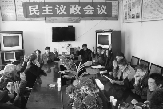 这次的民主议政会内容有三项:第一项就是春季浇水、生产启动的问题,其次是元宵节秧歌活动情况的公开,随后是通报财务开支情况。已是69岁高龄的老支书吴臣义说,马上就到了浇地的时间了,上游下来的河水少,所以浇地要提前开始,抢水灌溉,“争取能多浇一点是一点。”现场村民都很赞成,集体举手表决通过。接着,会计吴国华通报财务开支:“公路硬化用砖7200块,每块砖是3毛钱……”上至几万几千元的开支,下至几元几角,吴国华都给大家一一通报。