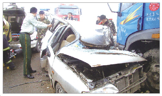 消防官兵到达事故现场后发现,一辆奇瑞牌汽车迎面撞上大货车,汽车受撞击严重,两名男性乘客被困驾驶室内不能动弹,被困司机头部被划伤后鲜血直流,另外一名乘客被困后排座位上,被困人员意识模糊并痛苦呻吟。