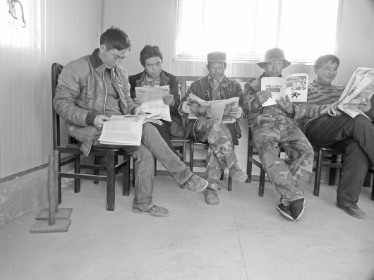 中心建成了,陈立吉(右一)与农民工兄弟一起读报。
