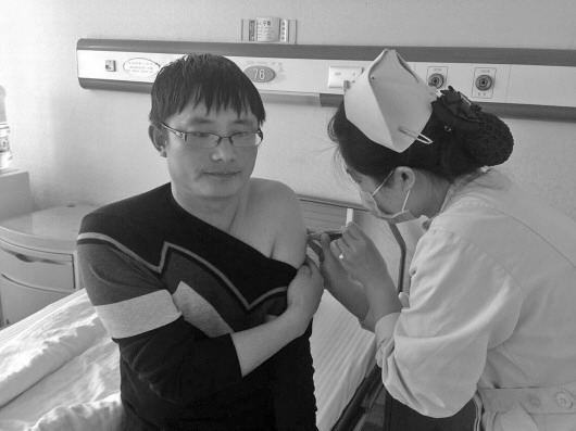 21日,宁青在医院病房注射动员剂,为采集造血干细胞做准备。 本报记者 陈晓丽 摄