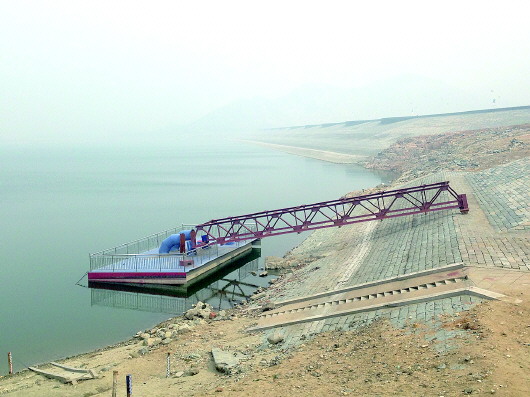 21日,泰安泰城自来水虹吸工程的浮标漂在黄前水库的库面上,岸边的白色浸渍与现今的湖面相差不少。“白色痕迹是去年10月底汛期结束后形成的。”水库管理局工作人员说,当时水位为204.54米,而今是198.39米;现今蓄水量1900万立方米,去年同期为4200万立方米。