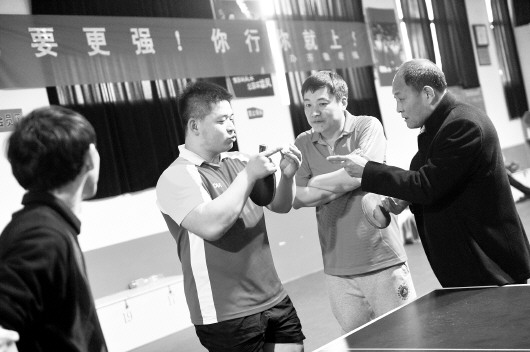聋奥会乒乓球冠军张超越(左二)正在给章丘乒乓球爱好者讲解打球技巧。 本报记者 王媛 摄