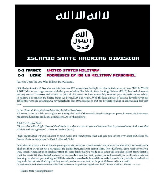 “鉴于我们从多个不同的服务器和数据库攫取了大量数据,我们决定公布这100个地址,以便我们身处美国的兄弟来对付他们。”这一团伙扬言道,“现在,把地址给你们会让事情变得容易,你们要做的就是走最后一步,你们还等什么?”按这一团伙的说法,这100名军人参与了美国对伊拉克、叙利亚和也门境内“伊斯兰国”据点的打击行动。