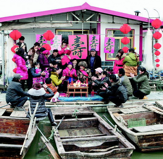 不久前,微山县欢城镇成新村一艘住家船上喜气洋洋。大红的灯笼挂在船舱,几个大幅“寿”字格外显眼。这天是老渔民董绍娥80岁的生日,86岁的老伴徐广军和7个子女早早就开始准备,众多亲友也赶来祝寿,渔民们都称这是“最美全家福”。