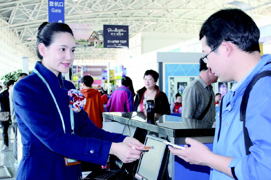 地服部优翼班组组员何伟正在登机口为旅客服务