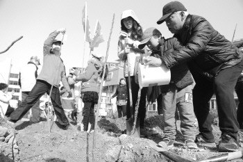 22日上午,本报组织第二期植树活动,300余名志愿者种下千余棵树。小朋友在大人的帮助下也忙活得有模有样。