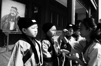 3月21日农历二月初二,民间有“龙抬头”的说法,蒙正学堂在海源阁举行“开蒙礼”仪式,通过让小朋友们参加师正衣冠、行拜师礼、朱砂启智、击鼓鸣志、开笔破蒙等传统“开蒙”活动,来感受国学,传承中华传统文化。图为老师在孩子们的额头上"朱砂启智",寓意孩子们开启智慧、发奋读书。