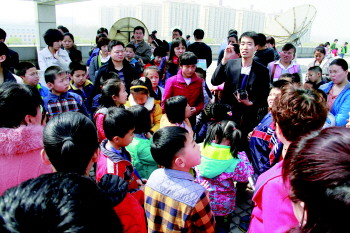 天台上,气象局的工作人员为小记者和家长们讲解如何监测天气预报的。