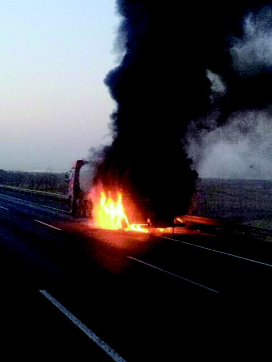 21日18时10分左右,在荣乌高速滨州段北京方向,无棣服务区南一公里处,一辆拉柴油罐车行驶中轮胎突然起火,火势渐大,随时有爆炸的危险。无棣公安消防大队消防员立即赶到,10分钟即将大火扑灭。 (网友供图)