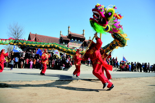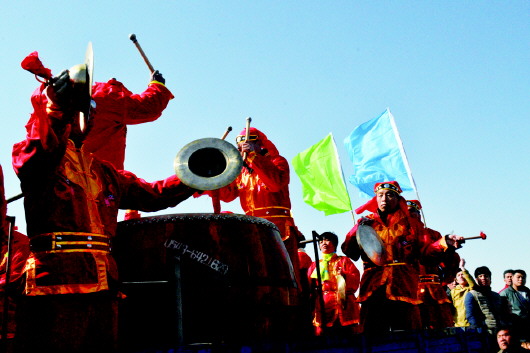 与龙王庙内的庄重不同,广场上锣鼓震天,第二届“汇泰杯”锣鼓大赛的8支代表队正在举行擂台赛,锣鼓队员们用力地敲打着,用最强的声音传达真诚的祝愿。在锣鼓大赛中,马山子镇代表队展示了流传200多年的武秧歌,20余人的阵容,从服装、人物角色到动作和队形变换,均保留了传统鲁北武秧歌的特色。