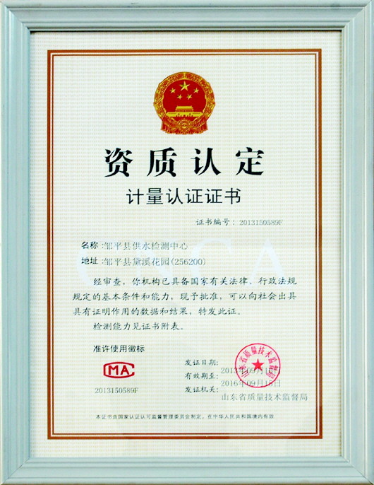 2013年9月,邹平县自来水供水检测中心通过了山东省质量技术监督局组织的省级资质认定评审,获得“计量认证”资质。该中心拥有可独立调配使用的检测设备23台(套),可进行微生物指标、感官性状和一般化学指标、毒理指标等54项自来水水质监测。这标志着该检测中心的环境条件、计量标准、操作水平、原始记录等软、硬件条件均达到国家规定的要求,可以提供关于水质质量评价、成果及司法鉴定等具有法律效力的公正数据。