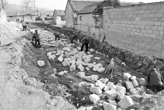 近期,乳山市午极镇2015年环境整治村的工作进行。图为石字岘村的村民正在浆砌村内中心河的河道。