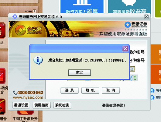 最先遭到吐槽的是申万宏源,股民称早盘集合竞价结束后,申万宏源证券系统登录、刷新不断显示“后台繁忙,请稍后重试”,电脑端和移动客户端均无法登录进行交易,只能进入独立行情页面进行行情查看。而不少股民还反映,申万宏源的电话客服、人工客服始终无法打通,在线客服页面也无法正常打开。