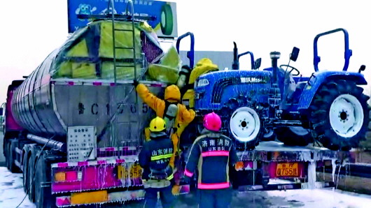 本报96706热线消息(记者 尉伟 实习生 韩秋阳 侯鹏超) 3月22日下午,济青高速唐王立交东侧,一辆载有31吨氯丙烯的罐车不慎与一辆载有拖拉机的货车发生碰撞刮擦,罐体受损,大量氯丙烯液体泄漏。消防人员在喷洒了十余吨清水、泡沫后,成功堵漏化解了险情。