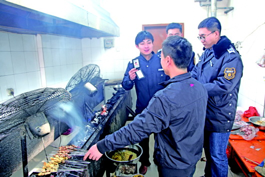 历下城管执法队员检查烧烤经营业户油烟净化设施。