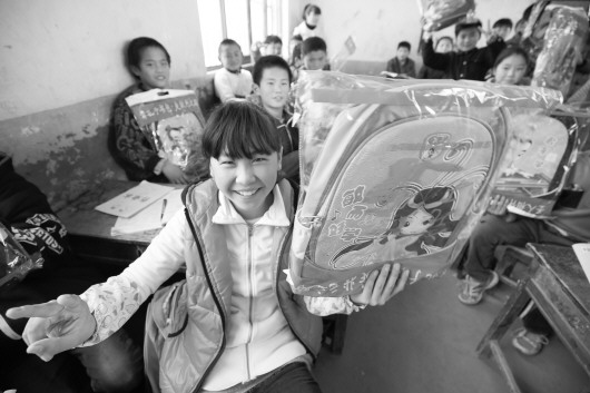 拿到新书包,读五年级的刘子扬第一时间就用上了,新书包来了,装书用的布袋也终于可以“退休”了,子扬告诉记者,其实以前她有个书包,但自从坏了以后,这个布做的购物袋就成了她的书包,而今,书包终于不再是布袋,子扬有些爱不释手。