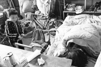 6岁的贺家昌一声声呼喊,只换来妈妈偶尔的“嗯”声回应。 本报记者 李军 摄