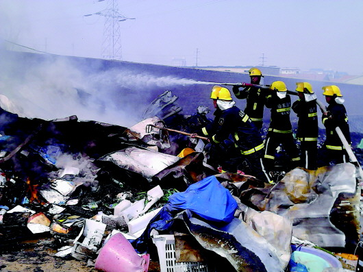 走进浓烟始源地看到,原来是一家大型的废品收购站发生火灾,消防员们正在全力灭火。由于该废品站规模较大,着火的地方也是连接成片,加上东侧和北侧都挨着荒草地,所以灭火的难度较大。废品收购站的老板刘师傅和老伴走上前来,脸上充斥着慌乱与无奈。