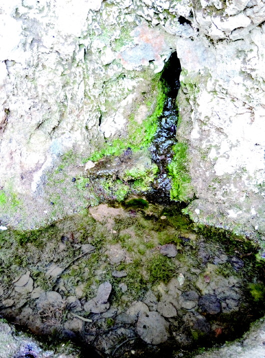 打开卷帘门进入洞穴中,门后大约有八级阶梯,沿着阶梯下去,有一蓄水池,水质清澈,泉水不时从洞穴上方沿着石壁滴答下来,但泉水水位很低,只有30厘米左右。