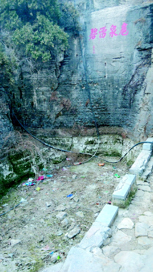 扈泉一侧的山体上写着四个大字“扈泉涌碧”。东峪村村民刘先生告诉记者,扈泉早已经干涸了,如今算起来,少说得有5年了。“原来扈泉的水喷得可旺了,能把附近河道都浸满了。尤其是雨季的时候,我们浇地都用泉水。但是这些年干旱了,加之鲜有人管理,泉子的水就越来越少,大约在5年前,扈泉就彻底干涸了。”