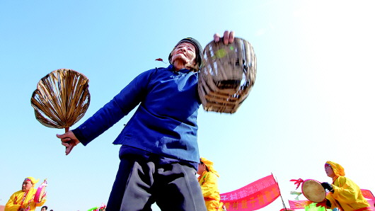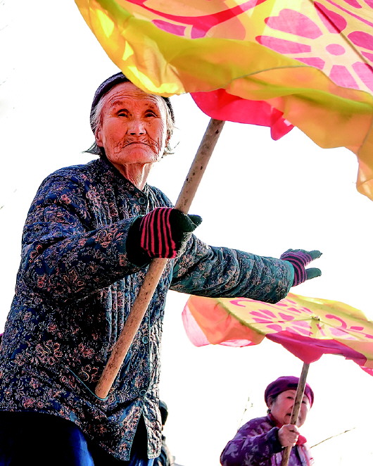 在商河,从不说“扭秧歌”,大家习惯称之为“跑秧歌”。鼓声响起的刹那间,所有的表演者都在不停地跑动。每一个动作都有讲究,每一声鼓点都有内涵,大家在不知疲惫的奔跑中诠释出伞、鼓、棒、花等不同角色的真谛。“头伞”是每支秧歌队的灵魂,他们跑一场下来的运动量足以堪比五公里的越野,在冬日里汗流浃背是常事,问及此,大家乐呵呵地回一句:“跑一场痛快。”
