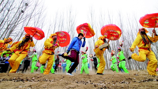 正月里,商河一直有“跑十五”的传统,每年的正月十五前后,一场又一场的鼓子秧歌盛宴接踵而至。今年的正月十四,在商河县全民健身广场12个乡镇的鼓子秧歌和商河县第一实验小学、鲁北鼓子秧歌队齐聚一堂,互相切磋。激情洋溢的鼓、潇洒飘逸的伞、诙谐幽默的丑、翩翩起舞的花……上百人的队伍用现代人的方式演绎着古老阵型的变化。一波又一波的呐喊欢呼、一次又一次的掌声雷动,是商河人民给予鼓子秧歌表演者最高的礼遇。
