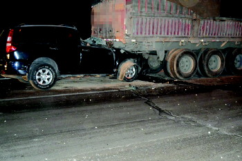 本报2110110消息(记者 孟杰) 23日凌晨,北二环与105国道路口处,一辆越野车钻进了前方半挂车的底部,越野车前座车顶几乎被削平,驾驶员身受重伤,送医后抢救无效身亡。
