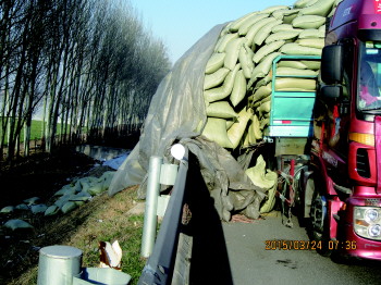 在第一起事故中,货车后面装载的袋装糠滑落下来,掉在地上和沟里。