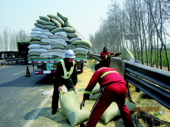 布控好事故现场后,路政人员安排小轿车及第一辆货车司机先将事故车开走,避免道路拥挤,随后对洒落货物的第三辆车实施清障。“我们又从总部调集了吊车和半挂车对货物进行倒货,并安排专门人员对路面进行清扫。”路政人员说,大概两个半小时后事故处理完毕。