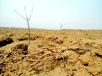 耕地里刚刚栽植上树苗,有的根部还裸露在外。
