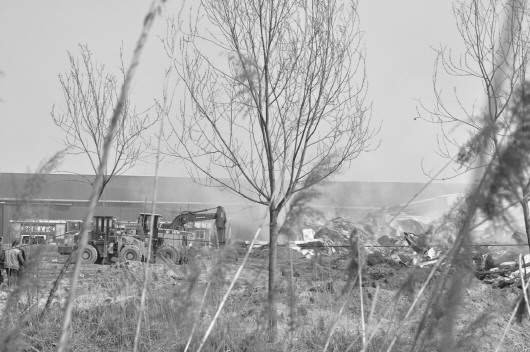 随后,记者选择了一处距离封锁路口最远的位置,从树林中向火灾现场走去,当记者到达着火公司的外围墙时,看到公司内已被火烧得乱七八糟,几名男子正站在着火的外围,有几处地方还在冒着明火和浓烟,有几辆消防车停在里面。