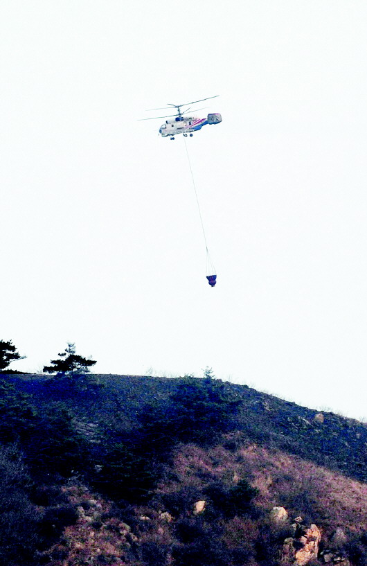 但由于着火地段山高路险,地势陡峭,平均海拔在六七百米左右。在风力的作用下,26日,火势还一度蔓延到山体东侧。东侧山坡缺少进山的路,为紧急救援,山东省林业厅的直升机也投入灭火行动。26日,从上午7时至下午4时,共有三架直升机参与灭火。下午5时许,仍有直升机从十五公里以外的锦绣川水库运水前往梯子山灭火。