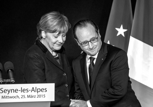 ◥3月25日,法国总统奥朗德(右)与德国总理默克尔在关于失事客机的联合记者会上相互致意。