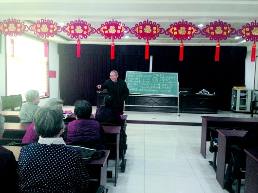 吴家村的老年公寓活动室中,老人们在学习健康知识。