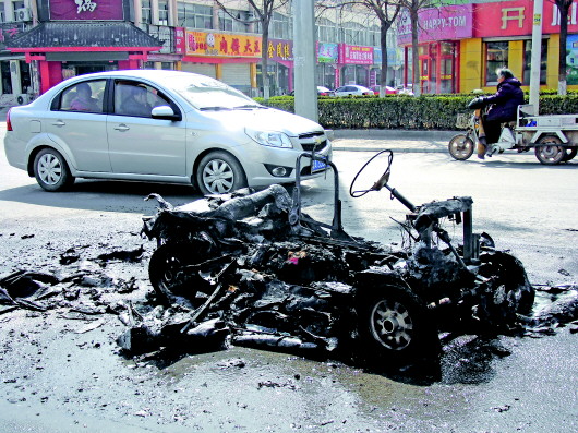 本报3月26日讯(记者 张健) 近日,王先生给本报打来热线称,他在步行街南头路过时,身边的一辆老年代步车自燃了,火势凶猛,经过约20分钟的燃烧,老年代步车已经烧成了铁架子。