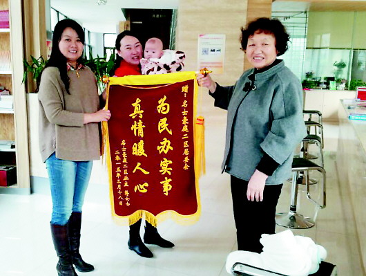 现在可爱的宝宝已经三个月了,昨天蒋芳一家抱着孩子来居委会,为表谢意,她特地为社区居委会送来锦旗,说居委会让他们感受到了社会大家庭的温暖。