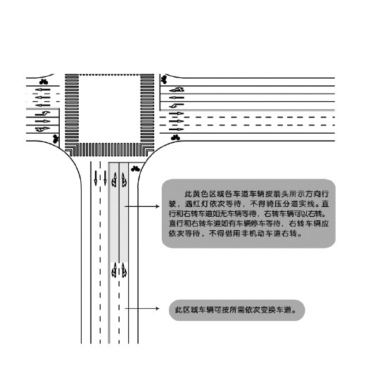 “第三种情况就很简单了,右转、左转、直行与非机动车道都有,这样驾驶员就得按照‘各行其道’的原则过路口了。”民警说。
