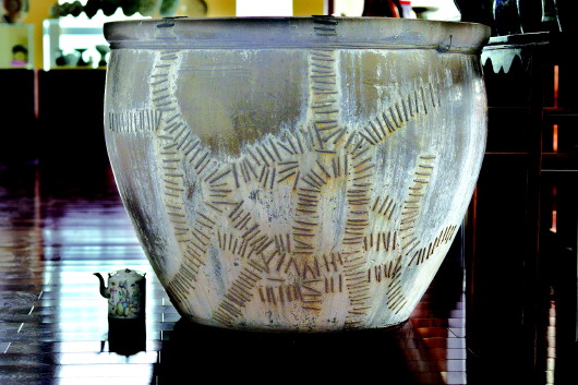 在张湜的收藏室里,有一个直径112厘米的大水缸非常扎眼,这件“宝物”是2013年通过青州一位邱姓朋友收到的。这位邱姓朋友告诉张湜,大水缸原在青州一座海拔600多米的高山上,是一个山村十几户村民蓄水的家伙。大缸侧面密密麻麻地留下几百个锈迹斑斑的铁质锔钉,每个锔钉5至6厘米,顺着大水缸的炸纹排列,看上去像“铁树开花”一般。在大水缸的口沿部,清晰留有至少两次锔补的痕迹,前期锔钉已脱落,留下锔眼。后期锔钉仍在发挥作用,确保大缸滴水不漏。有懂行的人分析,这些铁锔钉很可能是当年章丘铁匠锻打出来的,纯手工制作,本身就承载了本地的手工艺发展史。