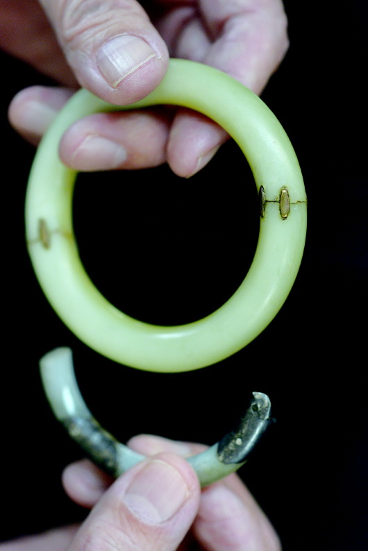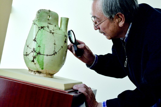 张湜先生仔细观察一尊辽代盛器上的锔钉。