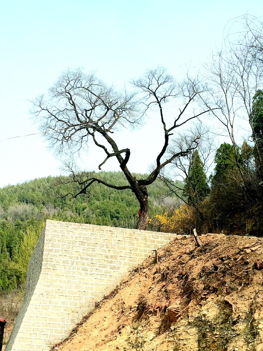 28日下午,记者在西捎近村见到了这株生长在小山坡上的降龙木。因未到长叶开花时节,降龙木远看光秃秃的,仅有4根比较大的树枝,树高十米左右,树干最粗处成人也不能环抱。记者注意到,一根碗口粗的树枝被折断,是个新留下的痕迹。另有至少两处树皮被利器所刮,留下了一厘米深、成人巴掌大的凹槽。