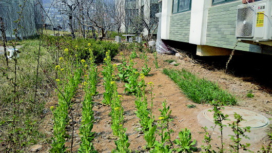 在靠近大门的4号楼,一单元门前一块长约3米的草地就被人种上了葱。“这还是去年种的,今年要再种点西红柿和黄瓜。都是种着玩的,反正原先那草地都枯黄了也没人打理。”一楼西户的业主告诉记者,开垦出这块地费了不少工夫,得施点肥菜才会长得好。