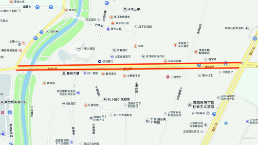 解放路作为连接济南东西方向的交通主干道,道路两侧分布着中豪大酒店、金融超市、鲁信大厦等单位,与如意街、十亩园街、青龙后街、七家村路、十亩园东街、后坡东街等街巷连接,西端与泉城路相连,早晚高峰、周末及节假日交通拥堵现象明显。作为泉城路商圈的东入口,解放桥路口由东向西方向已经多次实行临时交通管制。